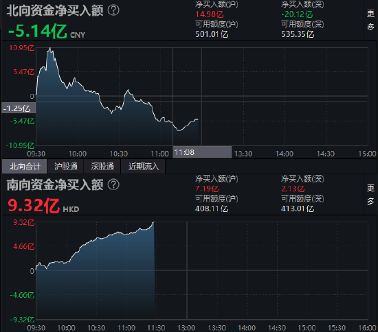 ,截至沪深股市午盘,北向资金净流出5.14亿元,沪股通净流入14.98亿元,深股通净流出20.12亿元。